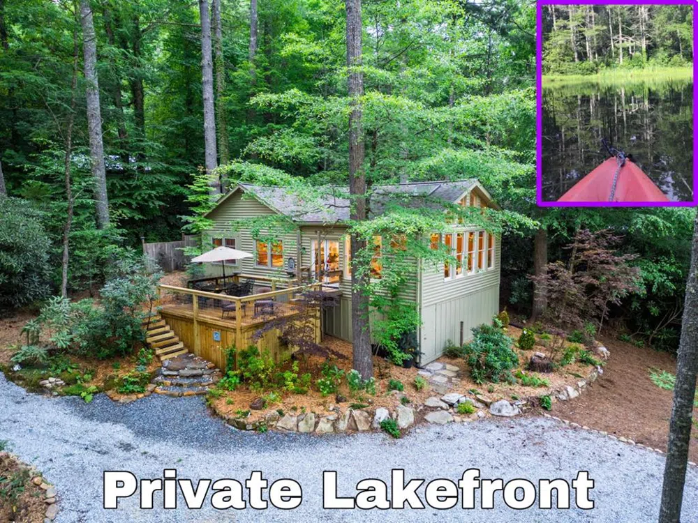 Nestled among the serene landscapes of the Western North Carolina mountains, a hidden gem awaits those seeking solace & adventure alike. Despite its seclusion, this mountain cabin remains within walking distance to Bucks coffee, post office, library, village green, local shops & eateries. This Mountain cabin has a perfect blend of rustic charm & modern convenience, ensuring a retreat like no other. 3+ acres of pristine land, this sanctuary boasts views of a private lake front. Imagine waking up to the gentle whispers of the wind through the trees & nature, all visible from the windows that adorn the living room & bedroom area. The renovated interior retains its original mountain cabin allure while incorporating contemporary comforts. Large living/dining room combo, gas log fireplace invites you to unwind after a day spent exploring nature's wonders. The kitchen has stainless steel appliances with lots of cabinetry, beckons culinary enthusiasts to indulge in farm-to-table creations sourced from nearby local markets. 2 bd 1bath, cathedral ceiling, recessed lighting central vacuum system ceramic tile bathroom, hardwood flooring landscaping New roof, exterior paint & deck.