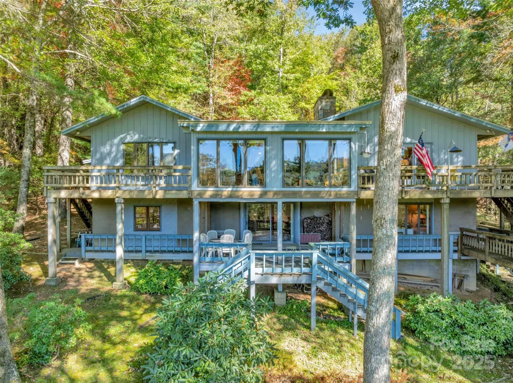 Remarkable golf course and mountain views from this immaculately maintained Lake Toxaway home. Situated behind the #16 tee box of LTCC with beautiful views from the living room, family room, and primary bedroom. This home is offered with main-level living, a heated sunroom overlooking the golf course, an expansive deck, and a fully finished basement with a private entry guest suite. This home offers many wonderful features including a wood-burning "Heatilator" fireplace, a generous walk-in closet in the primary suite, a water filtration system, and an oversized garage designed with a high garage door. The basement also features generous storage with a workshop, and a large covered deck overlooking the golf course. Square footage measurements note that the stairwell is unheated.